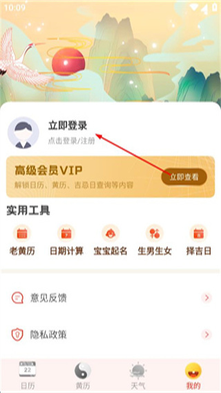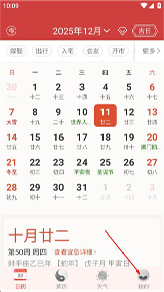 1、打开日历软件,查看当前日期信息,点击界面底部的我的选项,进入个人中心页面。