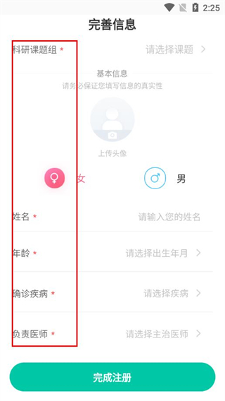 2、进入完善信息页面,选择科研课题组,填写姓名、年龄、确诊疾病、负责医师等带的必填信息。