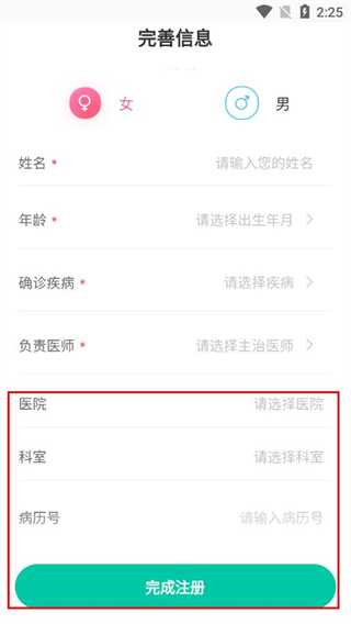 3、补充填写医院、科室、病历号等信息后,点击完成注册,完成账号注册。