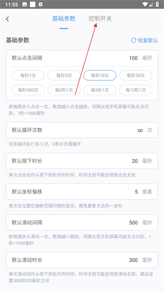 2、在设置页面找到基础参数旁边的控制开关选项,点击切换至控制开关界面。
