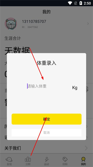 3、在体重录入弹窗的输入框中填写体重数值,点击确定。