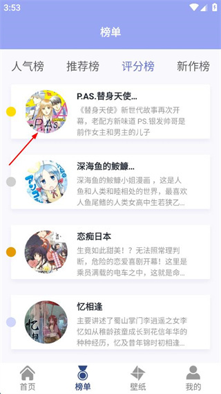 3、在评分榜列表中找到P.A.S.替身天使相关漫画,点击进入该漫画详情页。