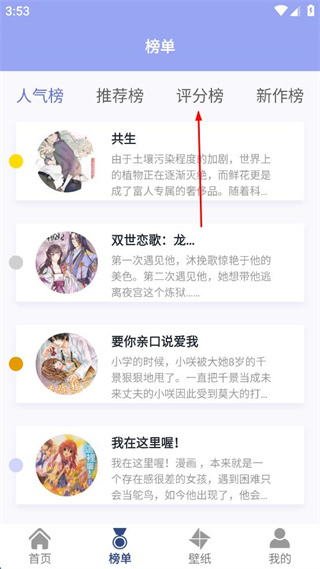 2、在榜单页面选择评分榜标签,切换到对应类别的漫画榜单展示列表。
