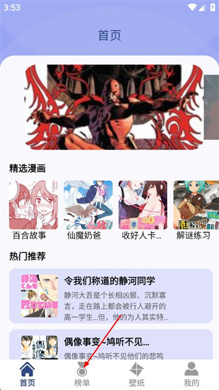 1、打开漫画阅读软件的首页界面,点击底部的榜单选项,进入漫画榜单页面。