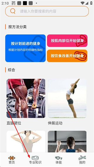 1、在健身管理app的首页,点击底部专业知识选项,进入专业知识页面。