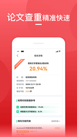 论文查重宝app拥有专业的论文查重检测系统,对比海量资源数据库,针对应届生毕业论文、语文论文、数学小论文、学术期刊论文、SCI论文、学位论文等均可快速方便完成查重检测。坚持客观、公正、精准、全面的原则,对学术不端行为进行管理,为用户提供详实的查重报告,为出版、科研、学术等提供支持!