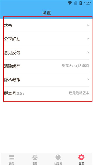4、在设置界面可查看求书、分享好友等功能,还能进行清除缓存等操作。