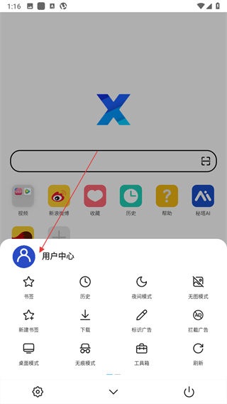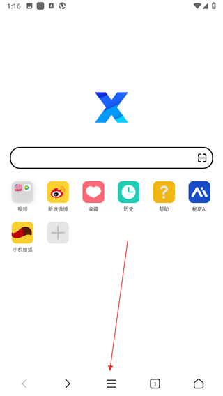 1、打开X浏览器主界面,点击底部导航栏中间的菜单按钮。