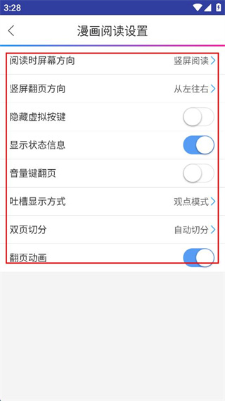 4、在漫画阅读设置页面,可调整屏幕方向、翻页方向等阅读相关的参数。