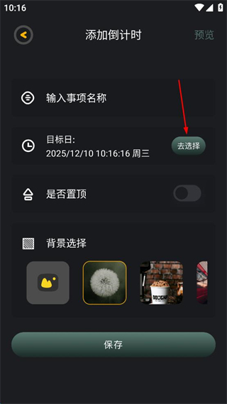 2、在添加倒计时页面,找到目标日选项旁的去选择按钮,点击该按钮打开日期选择界面。