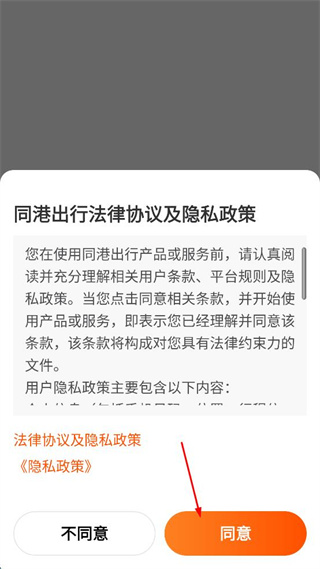 1、打开同港出行软件,看到法律协议及隐私政策弹窗,阅读内容后点击同意按钮。