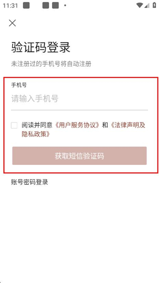 2、在验证码登录页面,输入手机号,勾选同意协议后,点击获取短信验证码。