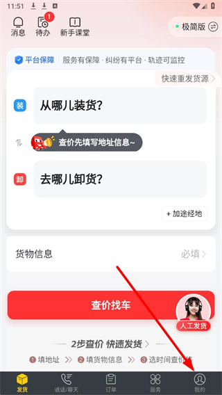 1、在货车帮货主app界面点击我的选项,进入个人相关页面。
