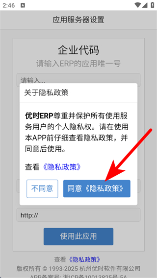 1、打开优时ERP,点击同意隐私政策,关闭弹窗进入应用服务器设置页。