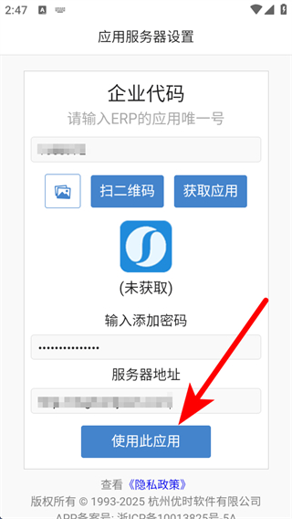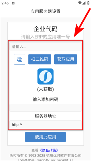 2、在设置页填写企业代码、服务器地址等所需登录相关信息。