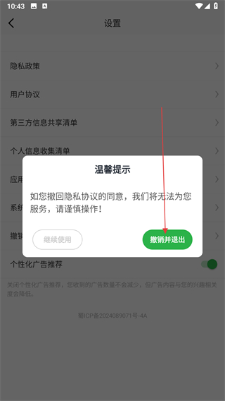 4、在温馨提示窗口中点击撤销并退出按钮,完成隐私政策同意的撤回操作。