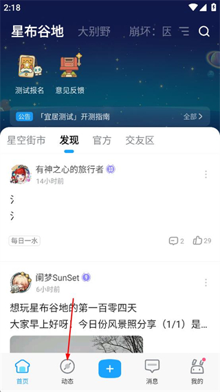 2、进入米游社主界面,找到底部导航栏中的动态选项,点击该选项进入动态页面。