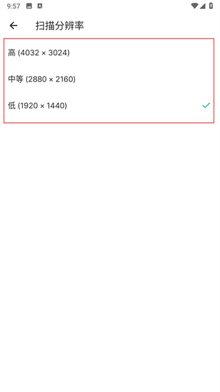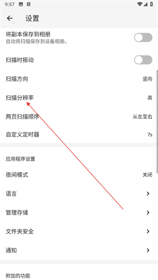 3、在设置页面中找到扫描分辨率选项,点击该选项进入分辨率选择界面。