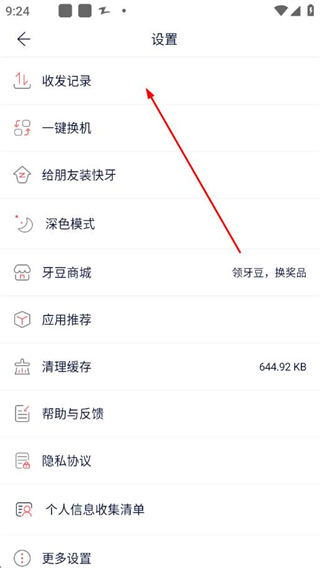 3、 在设置页面中找到收发记录选项并点击,跳转至收发记录查询页面。