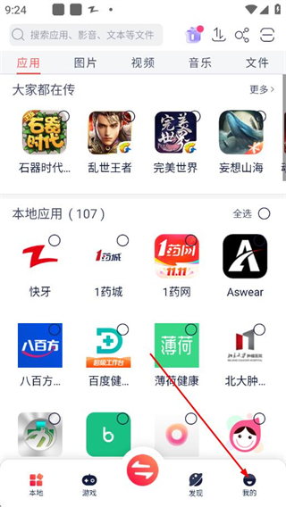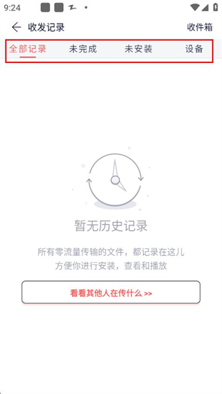 4、 在收发记录页面,可分类查看全部传输记录、未完成记录和未安装应用记录。