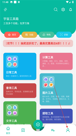 1、打开宇宙工具箱进入主界面,点击导航栏的我的选项进入个人页面。