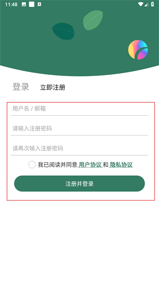 4、填写用户名邮箱注册密码并确认,勾选协议后点击注册并登录完成注册。