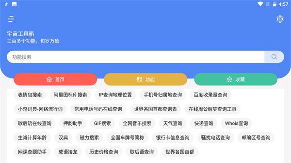 宇宙工具箱,三百多个功能,包罗万象。提供大量实用工具,多种类型尽在其中,支持图片/视频处理、计算、查询、娱乐等多方内容,满足用户使用需求,超多工具免费用。