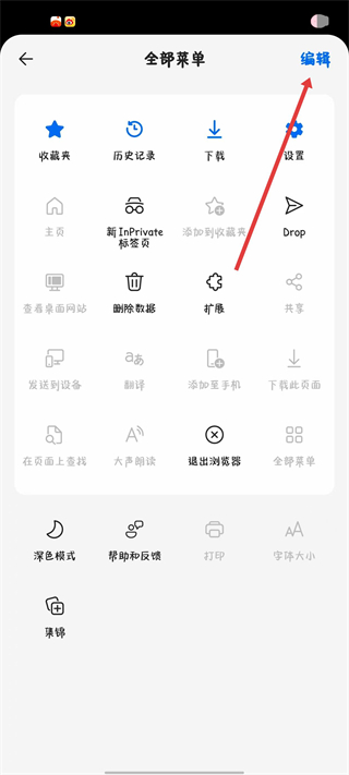 3、在全部菜单页面的右上角,找到编辑按钮,点击进入自定义菜单的编辑界面。