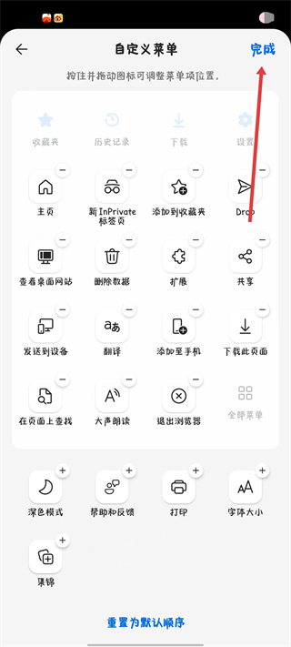 4、按住并拖动菜单项调整位置,或通过加减按钮增减选项,完成后点击完成保存。
