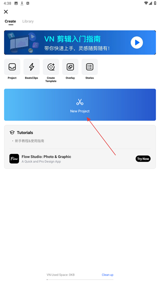 1、打开vn视频剪辑的APP,进入是点击剪辑的按钮。