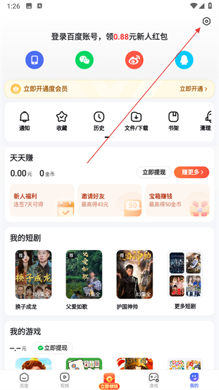 1、打开百度应用进入首页,进入个人中心页面,点击右上角的设置图标。