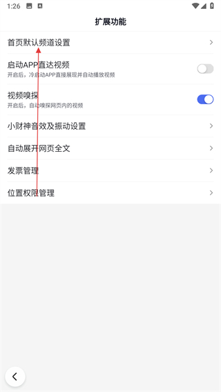 3、跳转至扩展功能的配置页面之后,在页面中选择首页默认频道设置。