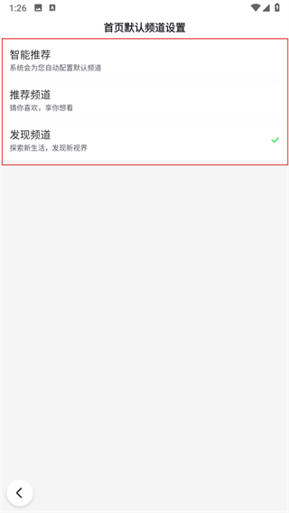 3、如果想要设置首页默认显示的频道类型,点击全部频道页面“默认首页设置右侧的智能推荐,在弹出的首页默认频道设置页面中,选择智能推荐,推荐频道或者发现频道等选项。