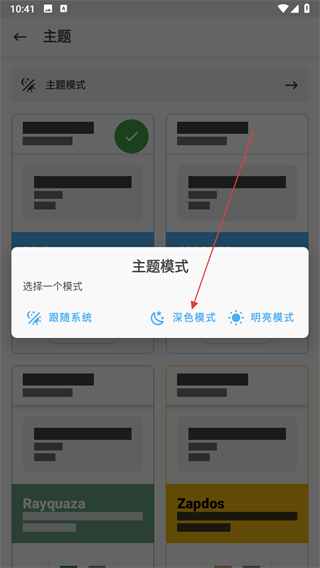 4、在主题模式菜单里选择深色模式选项,即可切换为深色显示样式完成设置。