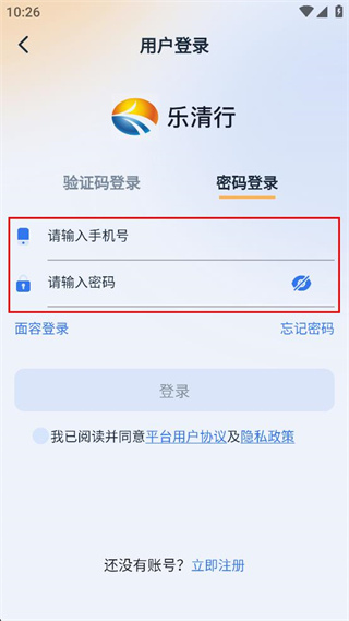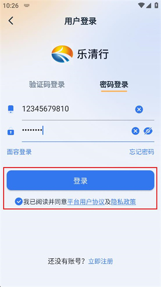 3、在对应输入框中填写个人手机号和登录密码,勾选同意相关协议。