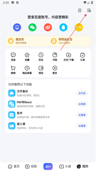 1、打开百度App,在个人中心页面右上角,点击功能菜单按钮。