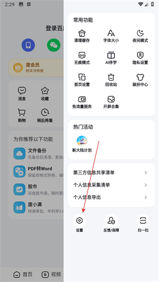 3、在功能列表中找到设置选项,点击该选项进入百度的设置操作页面。