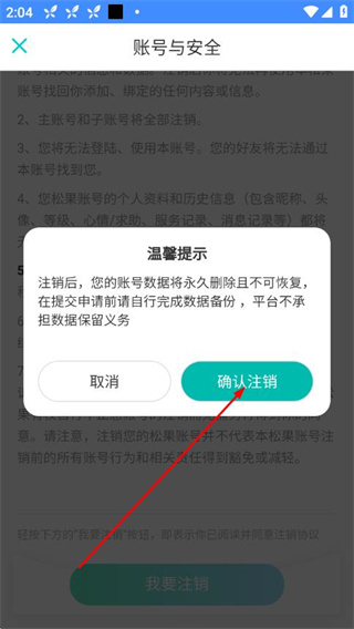 6、 在温馨提示弹窗中点击确认注销,完成账号注销操作。