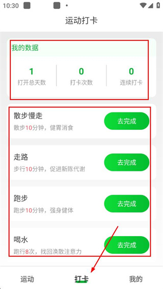 2、在打卡页面可查看打卡天数、次数等数据,提供散步慢走、走路、跑步、喝水等打卡任务,点击去完成即可参与。