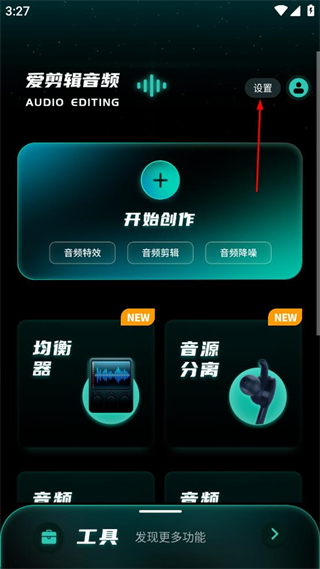 1、打开爱剪辑音频首页,点击页面右上角的设置选项,进入我的页面。