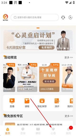 1、打开橘子倾听app首页,点击底部导航栏的心语,进入心语页面。