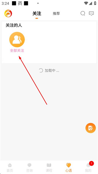 2、在心语页面的关注标签下,点击全部关注选项,进入关注列表页面。