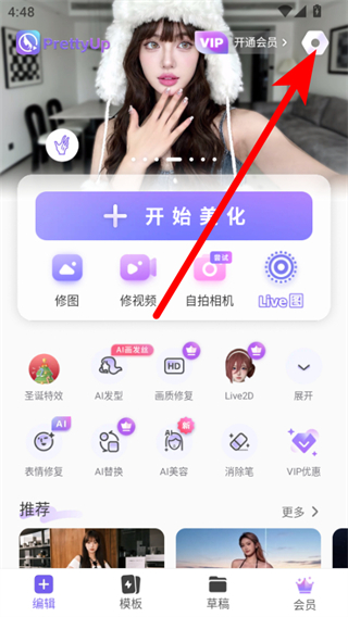 1、打开PrettyUp app,点击首页右上角的设置图标,进入设置页面。