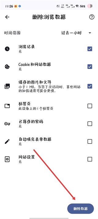 4、在隐私和安全页面中选择删除浏览数据,进入数据选择界面。