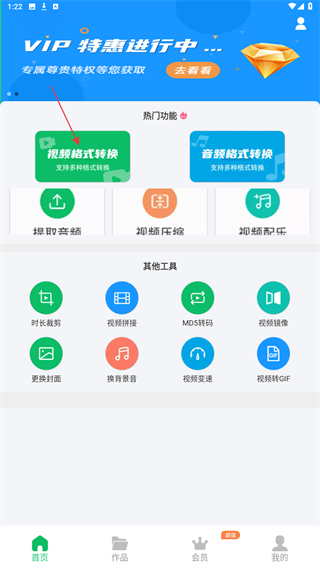 1、在软件主界面的热门功能区域,点击视频格式转换按钮,进入视频选择页面。