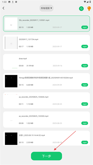 2、在视频列表中,选中需要转换格式的目标视频,然后点击页面底部下一步按钮。