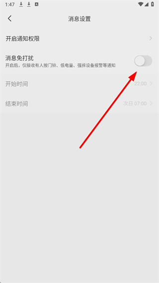 4、在消息设置页面,找到消息免打扰对应的开关,点击开关将其打开,即可启用免打扰功能。