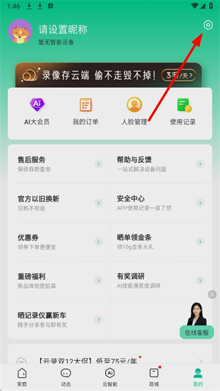 1、打开360智慧生活app,进入我的页面后点击右上角设置图标,进入设置界面。