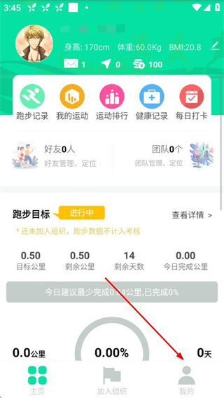 1、 打开位动酷跑app的首页,点击底部我的选项,进入个人中心页面。