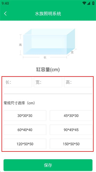 3、选择常规尺寸里的45*30*30选项,确认缸容量的参数信息,准备进行保存操作。